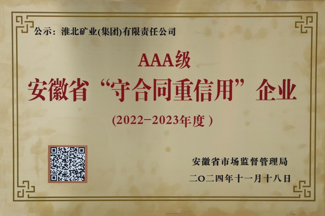 淮北礦業集團榮獲安徽省市場監管局頒發的3A級守合同重信用企業稱號